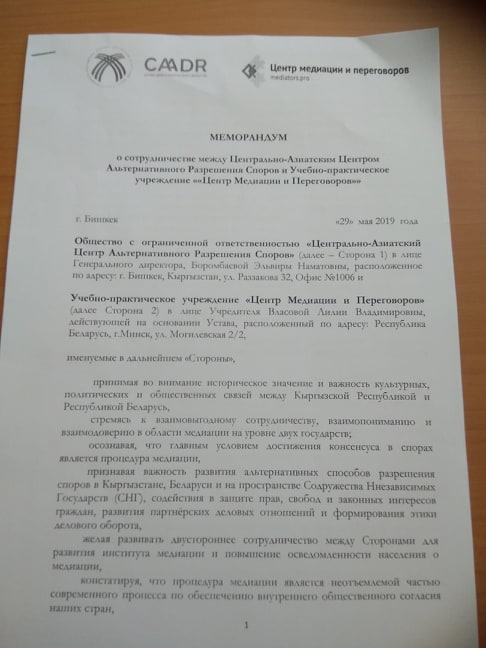 5 Июн 2019 Меморандум о сотрудничестве с Центрально-Азиатским Центром Альтернативного Разрешения Споров Заключен меморандум о сотрудничестве УПУ «Центр медиации и переговоров» и Центрально-Азиатского Центра Альтернативного Разрешения Споров (Бишкек). Related posts:Газета "Народная воля" о брачном договоре и о медиацииТренеры и эксперты Центра выступили на международной конференции по медиации "Опыт настоящего, персп...Центр медиации и переговоров в 2019 году